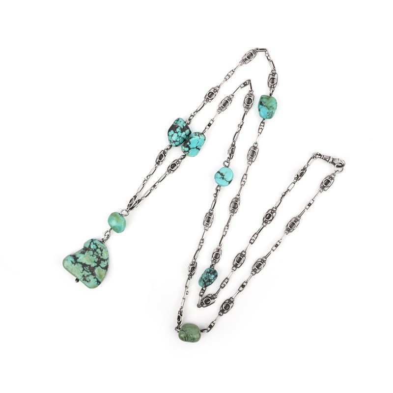 An Arts & Crafts silver and turquoise sautoir, in the manner of Amy Sandheim, with intricate