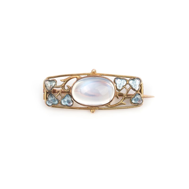 An Arts and Crafts moonstone and enamel brooch, early 20th century, set with a cabochon moonstone,