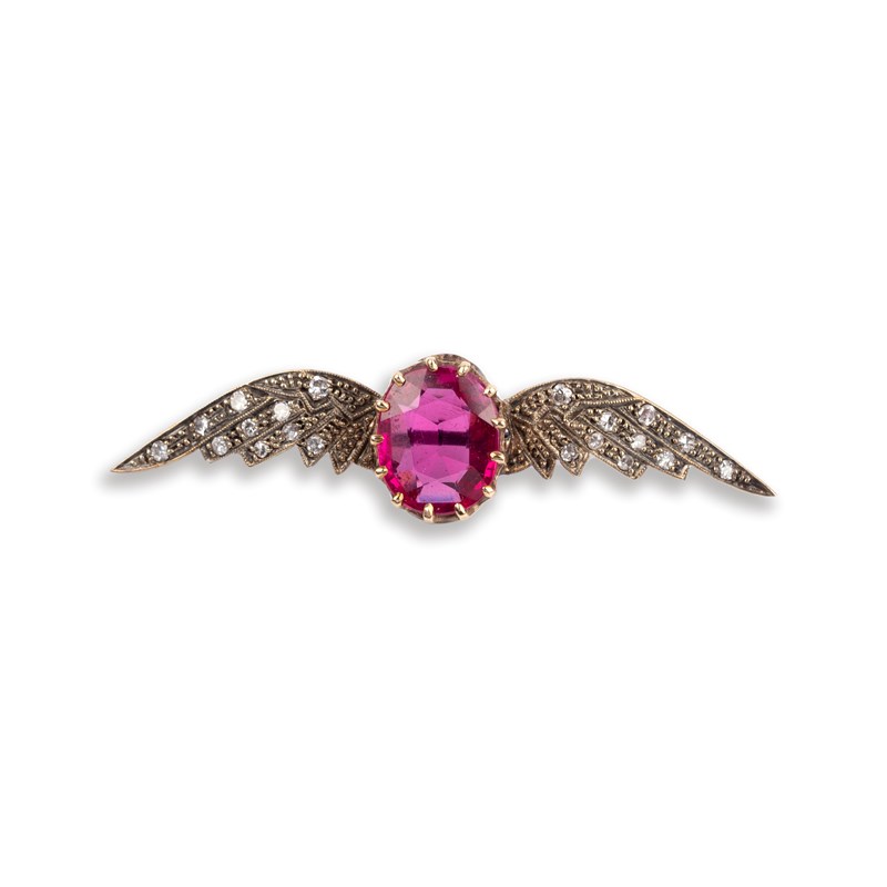 A synthetic ruby and diamond wings brooch, the oval synthetic ruby within diamond-set wings in gold,