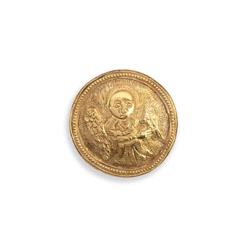 An unusual gold brooch, of Lombardic inspiration, designed as a circular medallion with repoussé and