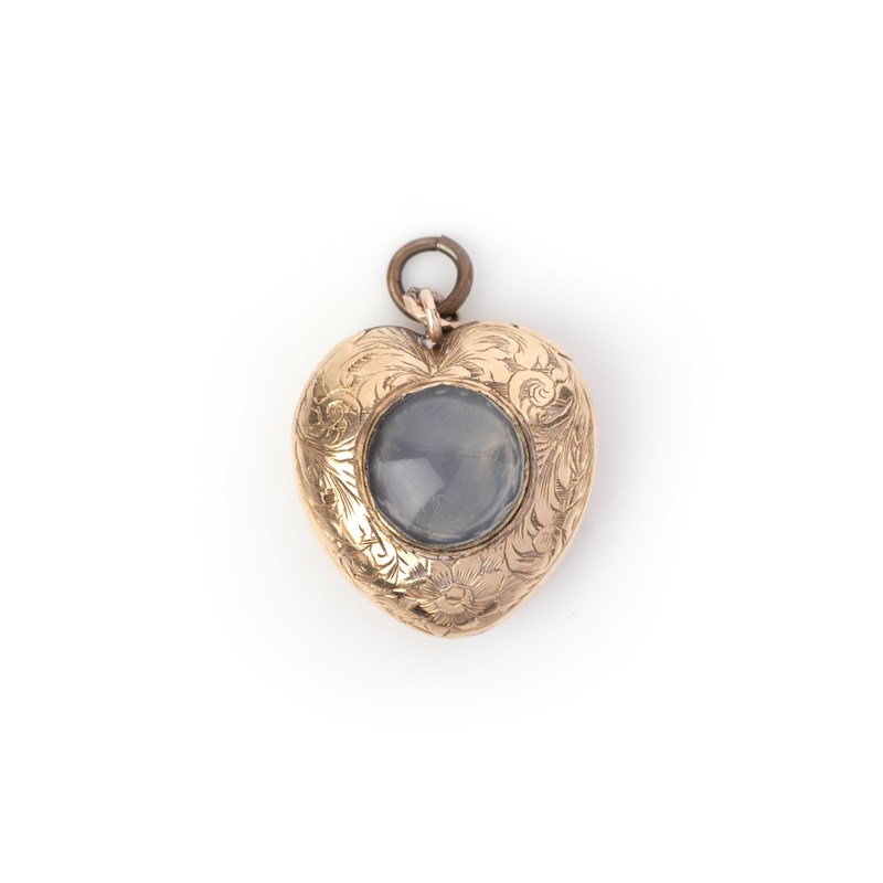 A gold and chalcedony pendant, 19th century and later, designed as a heart engraved with foliate