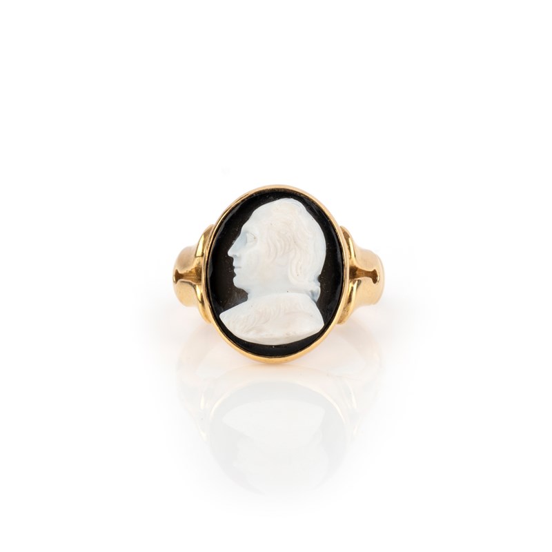 An onyx cameo ring, circa 1881, set with an oval onyx cameo depicting the philosopher John Locke