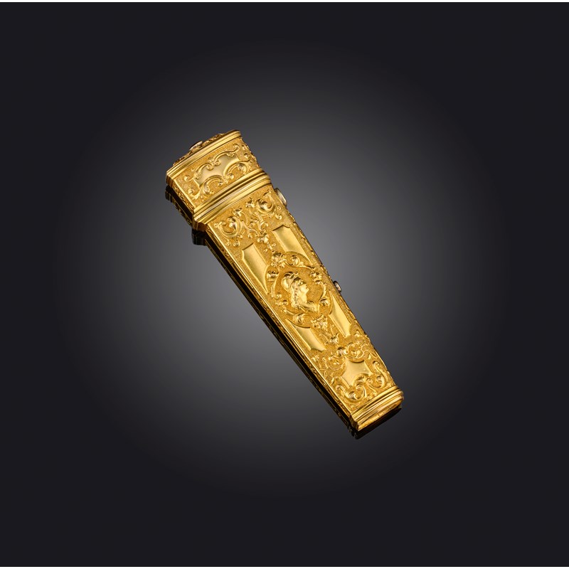 A gold and glass scent bottle and case, 19th century, the elongated glass scent bottle with a gold cap and glass stopper, length 7.6cm, within a tapering gold case with repoussé designs of faces in profile among floral scrollwork, set with foil-backed cushion-shaped garnets, length 8.4cm, original outer case
