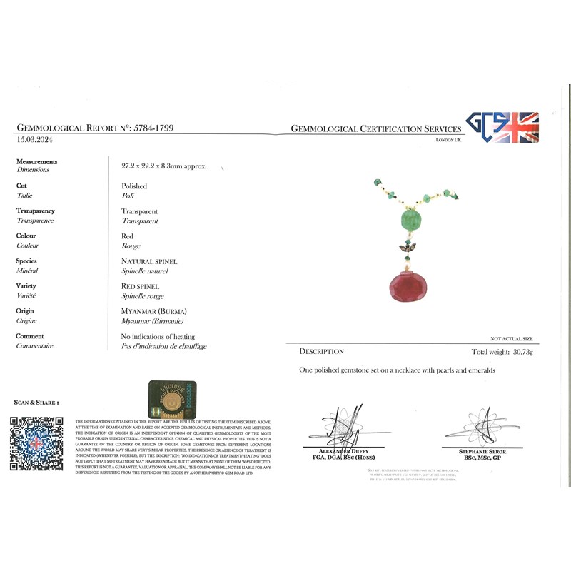 Accompanied by report number 5784-1799 from GCS dated March 2024 stating that the spinel is natural, with no indications of heating, origin: Burma