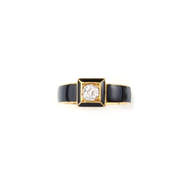 An enamel and diamond mourning ring, circa 1880, set with a cushion-shaped diamond in a square border, the setting and shoulders applied with black enamel, mounted in 18ct gold, the interior with commemorative inscription 'Eliza Brown, Born 17th Nov 1813 died July 14th 1880', size P, British hallmarks, date letter for 1880, sponsor's mark EE