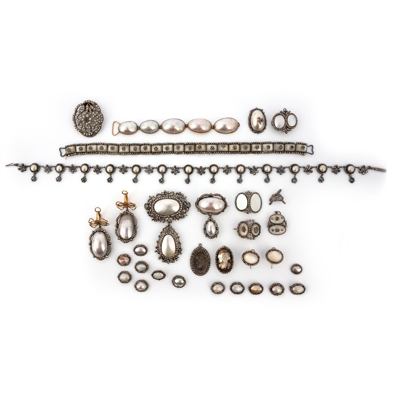 A group of coque de perle, mother of pearl and marcasite jewels, mid 18th century and later
