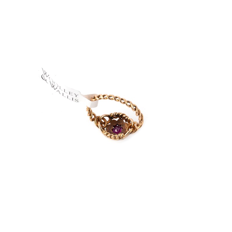 A seed pearl and ruby ring, late 19th century, composed of coiled gold wire and chain linking, centring on a cluster set with an oval ruby within a border of half pearls, size M1/2, pearls untested