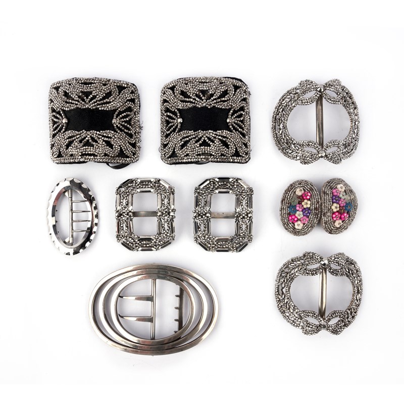 A collection of cut steel shoe buckles, 19th century, comprising: four pairs of buckles and one single buckle in cut steel, one ornamented with floral beads, longest 7.4 x 5.4cm; together with a silver buckle, 9 x 6cm