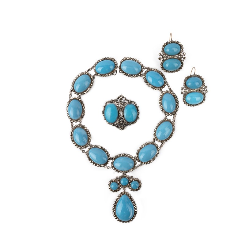 An enamel and marcasite parure, late 18th century, comprising: a necklace, a pair of earrings and a brooch, each set with oval sections of opaque blue enamel imitating turquoise, within borders of rose-cut marcasites, necklace length 27.5mm, with loops intended for a ribbon, pendant length 6.4cm, earrings 3.5cm each, late hook fittings; brooch 3.5 x 3.4cm, later brooch fitting, case