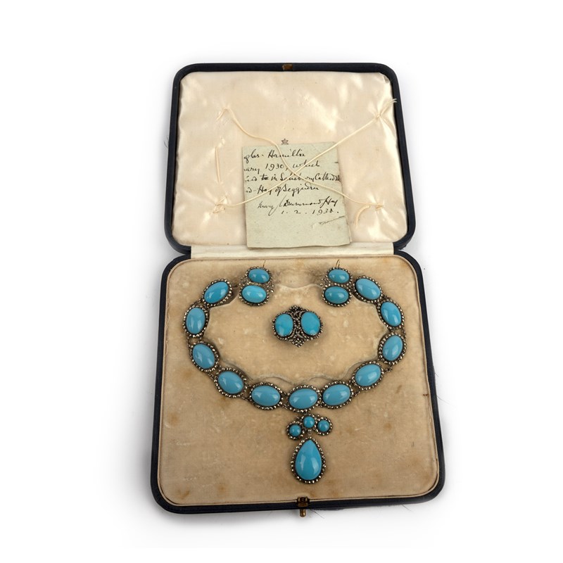 Provenance: Lady Margaret Drummond-Hay (née Douglas-Hamilton), daughter of the 13th Duke of Hamilton, who by repute wore this parure on the occasion of her wedding to Major James Drummond-Hay at Salisbury Cathedral in 1st February 1930, which was recorded on video by British Pathé, At the time of cataloging this video was available to view on YouTube.