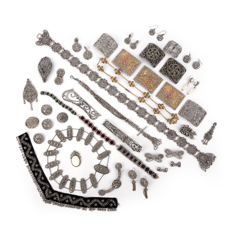 A large collection of cut steel jewels, late 18th/early 19th century, comprising: three necklaces, one composed of oval links connected by two rows of chain, length 47cm, another a choker on a black velvet ribbon; six pairs of earrings, including one set with simulant pearls, longest 6.5cm each, all with hook fittings; a chatelaine; a belt, length 60cm; a bracelet composed of four plaques connected by string; three bracelets on ribbon; five slides; a set of three matching panels accented with pink glass beads and velvet, one with a buckle fitting; four brooches; the side panel of a tiara; two bracelet clasps; the central section of a choker necklace; two pairs of buttons and two heart-shaped motifs