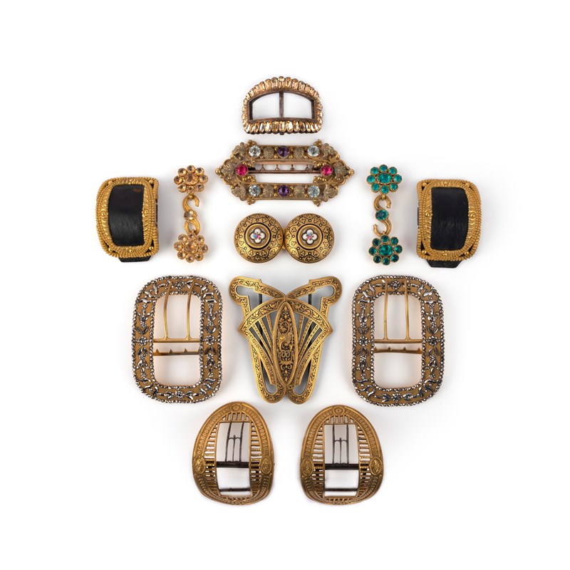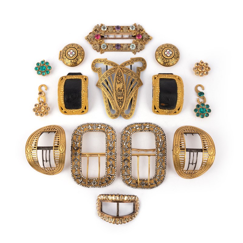 A collection of gilt metal and paste buckles, 18th/19th century, comprising: a pair of gilt metal and cut steel buckles; a buckle set with orange pastes; a foliate gilt metal buckle set with variously coloured pastes; two buckles set with clusters of orange and green pastes, centring on hooks modelled as snakes; two pairs of gilt metal shoe buckles, including one pair mounted on leather; a gilt metal and enamel buckle; and a large gilt and blackened metal belt buckle, 9 x 8.2cm
