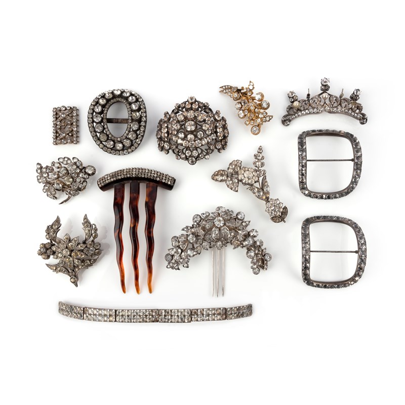 λ A collection of paste jewels, 19th century, comprising: four brooches of floral spray design, set with circular-cut pastes, longest 7cm; a buckle brooch of foliate scroll design, length 6cm; an oval buckle and a pair of rectangular shoe buckles, 5.5 x 4.6cm each; a hair ornament of floral spray design set with circular-cut and cushion-shaped pastes, 7.1 x 8.3cm including comb fitting; a paste and simulant pearl ornament, length 6.6cm; a tortoiseshell and paste comb, length 9.9cm; a paste link bracelet, length 16cm, rivet broken; a black ribbon choker with quatrefoil motifs set with paste stones; and a paste necklace motif and pair of bar links for a necklace