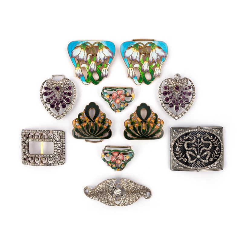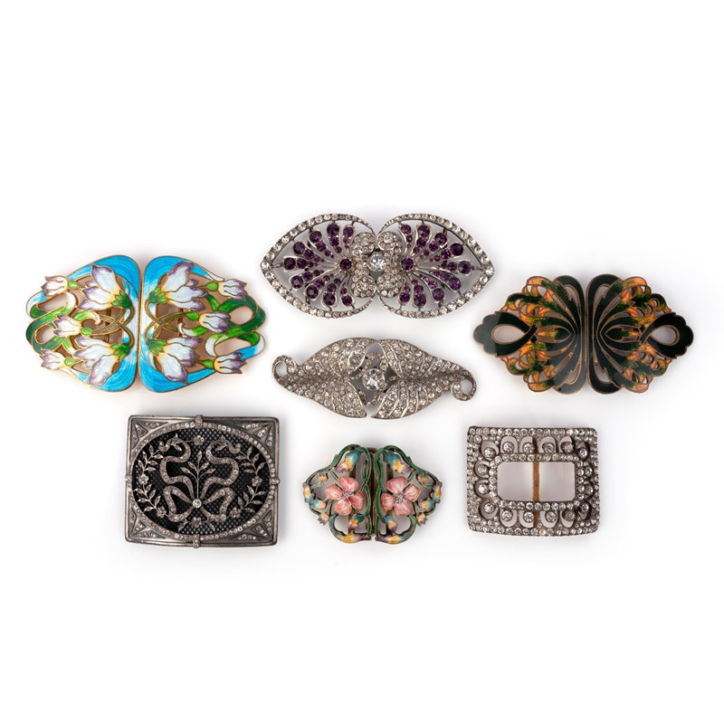 A collection of enamel and paste buckles, late 19th/early 20th century, comprising: three Art Nouveau buckles of floral design, applied with basse-taille enamel, largest 10.1 x 5.6cm; together with an Edwardian buckle designed as a pierced plaque set with colourless pastes; a fine buckle modelled as leaves of convolvulus set with colourless pastes; a buckle of palmette design set with violet and colourless pastes; and a rectangular buckle set with colourless pastes, largest 9.7 x 4.4cm