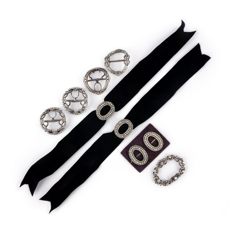A collection of paste shoe buckles, 19th century, comprising: one pair and one set of four buckles, together with three additional buckles, each set with colourless pastes, mounted in silver and base metal; largest 6.4 x 4.6cm