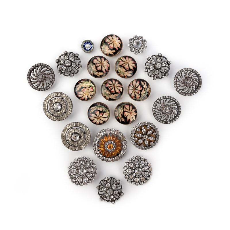 A group of buttons, 18th- early 20th century, comprising: two pairs and two groups of three matching buttons set with faceted colourless pastes, largest 2.9cm diameter; a button set with orange and colourless pastes adapted as a brooch, 3.6cm diameter; a set of eight buttons set with coloured mother of pearl mosaics depicting floral sprays on a black ground, mounted in gilt metal, diameters 2.4cm each; and three additional paste buttons