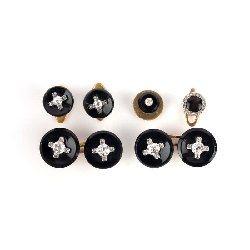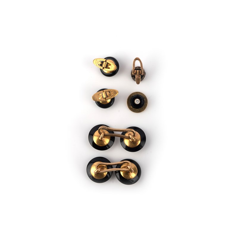 A pair of Art Deco onyx and diamond cufflinks and a pair of collar studs, France, early 20th century, comprising: a pair of cufflinks, each end composed of a circular section of onyx set with a circular-cut diamond held in place by prongs set with rose-cut diamonds, mounted in gold, diameter of each end 1.3cm. French assay marks for 18ct gold; a pair of matching collar studs, diameter 1.0cm each, French patent marks; together with two additional collar studs set with onyx and diamonds