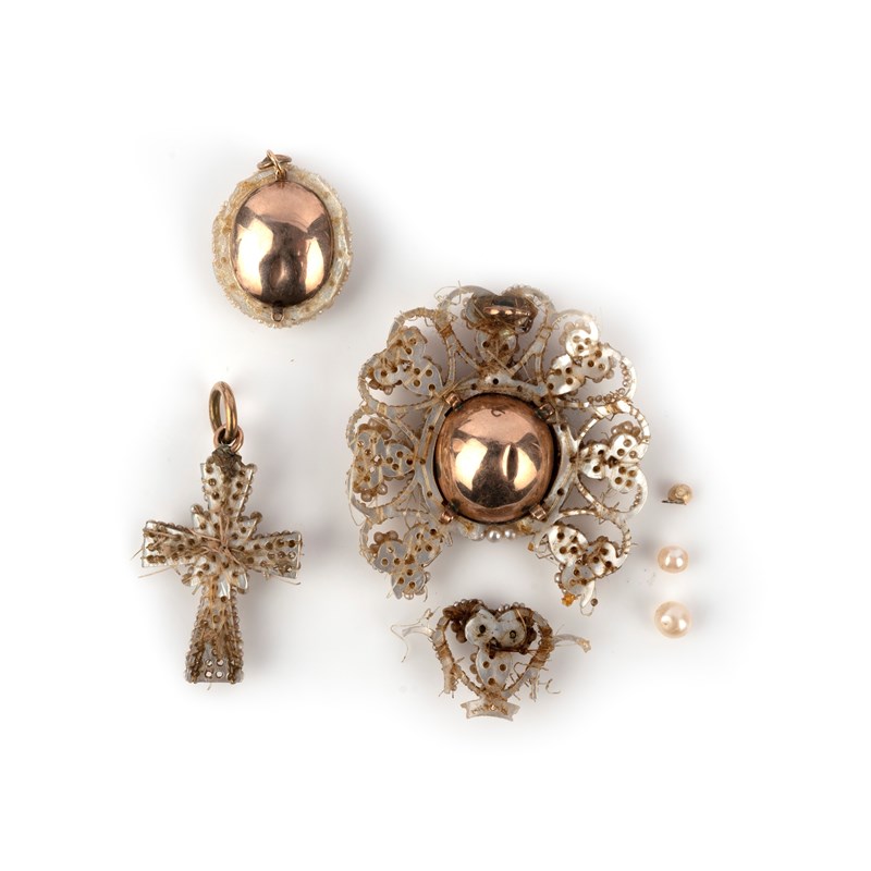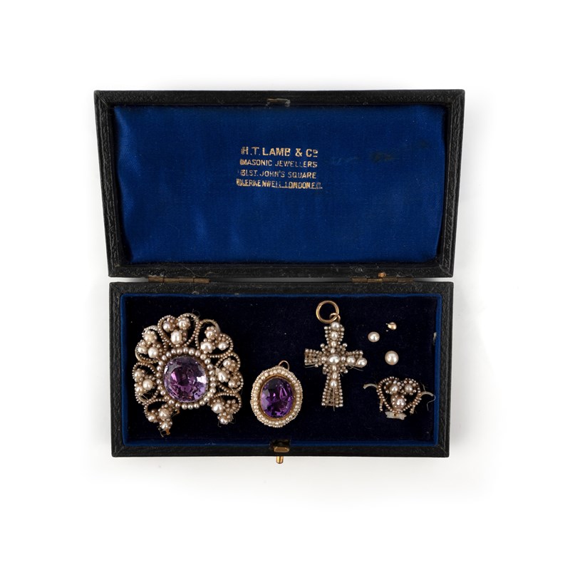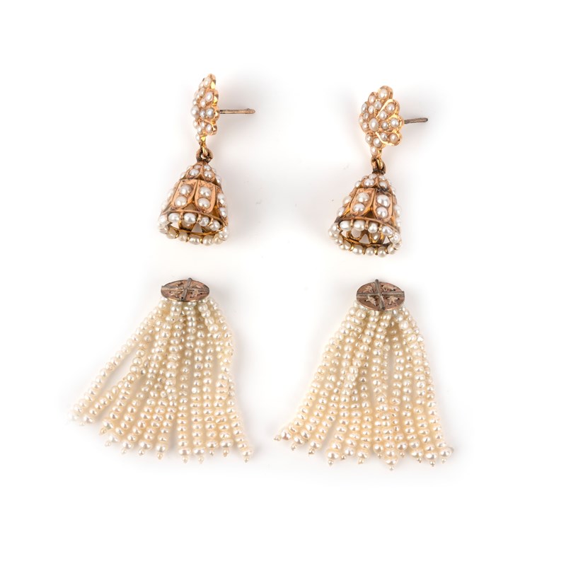 A group of seed pearl and amethyst jewels, 19th century, comprising: a brooch, set with a cushion-shaped amethyst in a closed-back setting, within a border of pearls and seed pearls, 4.6cm, border and brooch fitting broken; an amethyst and seed pearl pendant, length 2.5cm; a pearl and seed pearl cross pendant, length 4cm, damaged; a pair of pearl tassel earrings, post fittings, tassels detached; and a pair of simulant pearl earrings, pearls and seed pearls untested