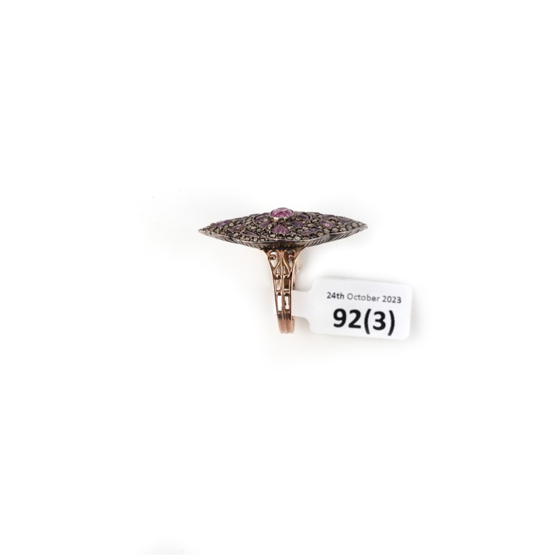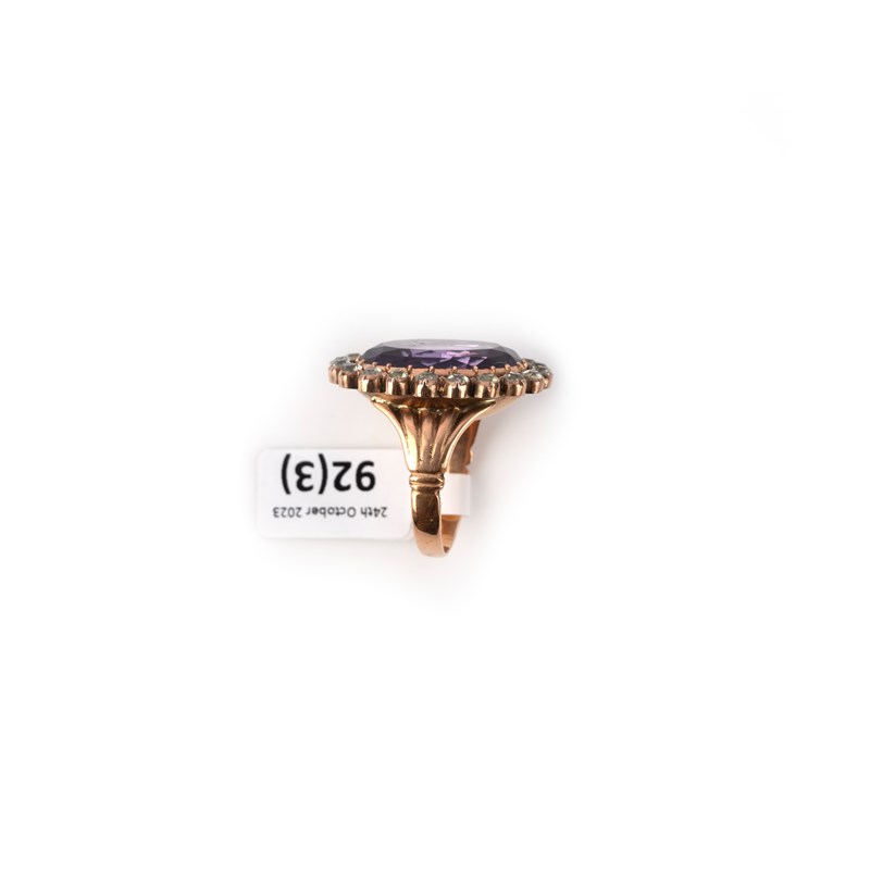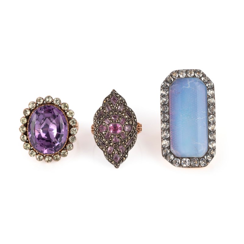 A collection of three rings, 19th century, comprising: a ring set with an oval amethyst within a border of circular-cut chrysoberyls, mounted in gold in closed-back settings, size O; an elongated plaque ring set with opaline glass over a patterned foil background, to a border of cushion-shaped colourless paste stones, mounted in gold, size O; and a ring of navette design set with variously cut pink topazes and rose-cut marcasites, mounted in silver and gold, size P1/2, indistinct assay mark