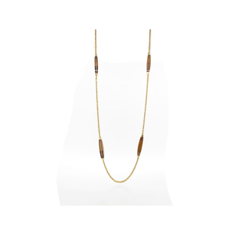 A late-20th century Italian longuard chain, the yellow gold byzantine-link chain set with four tiger's eye lozenge-form links, clasp stamped 750 and Italian maker's mark 419 AL, possibly for Vendorafa, Valenza, 87cm, 46g