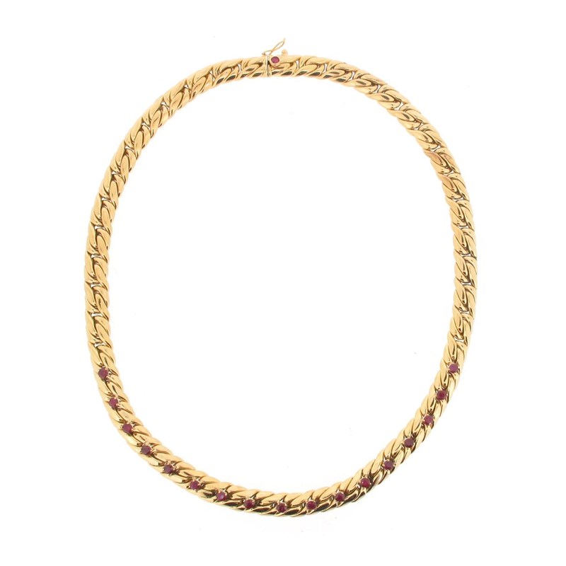A French gold collar necklace, set with circular-cut rubies, with French marks and maker's lozenge, stamped Caplain Paris, 35g, 39cm long