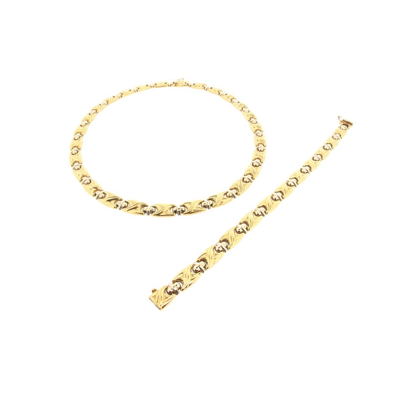 A fancy-link collar necklace, in bi-colour gold with a matching gold bracelet, 45g, necklace 41cm long, bracelet 18.5cm long