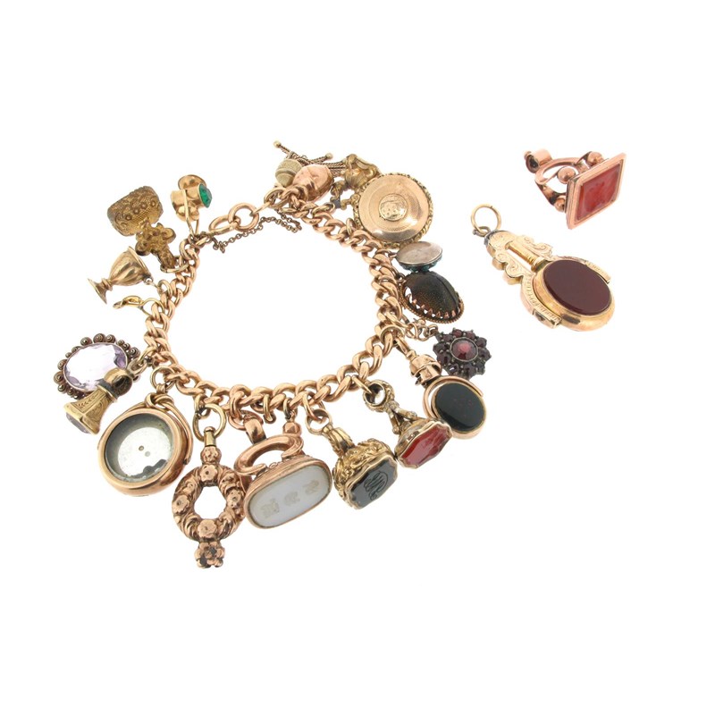 A gold charm bracelet, the curb-link bracelet set with seven seals, a gold locket (damaged), a gold compass (damaged) and various other charms, with two loose fob seals