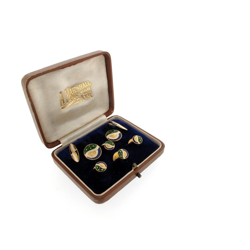 A pair of polychrome enamel cufflinks, of abstract design an decorated with guilloche enamel, with four matching studs in yellow gold, fitted case