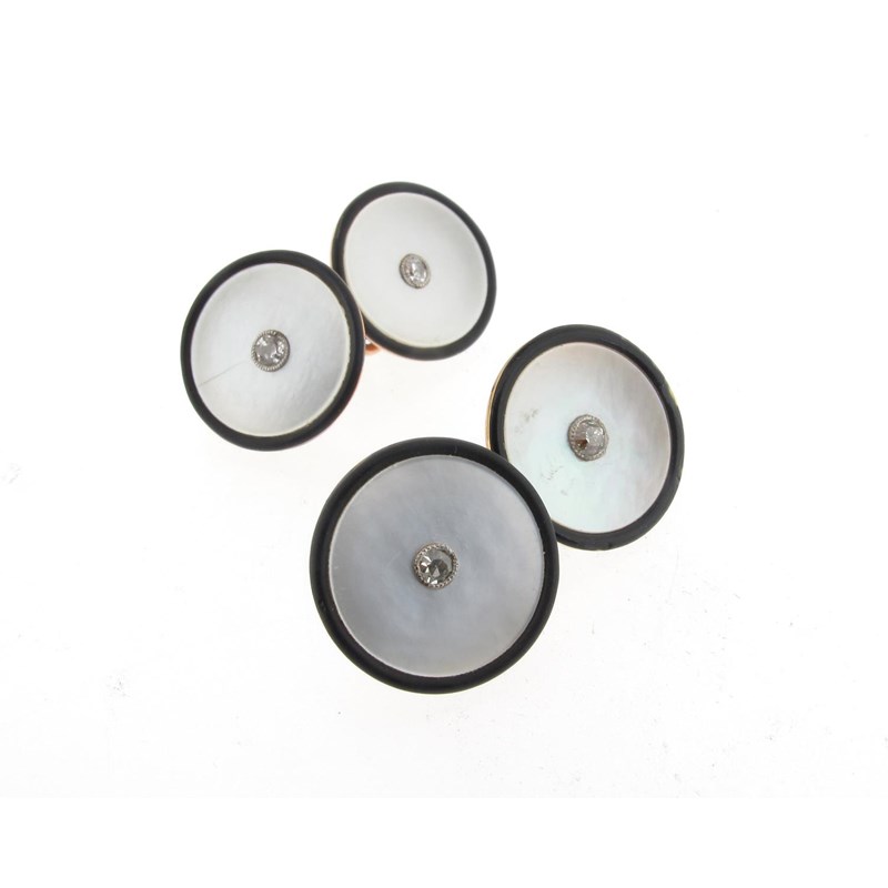 A pair of mother-of-pearl disc cufflinks, set with a central diamond and a border of black enamel in yellow gold, oval chain links