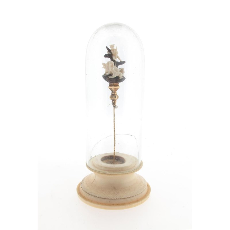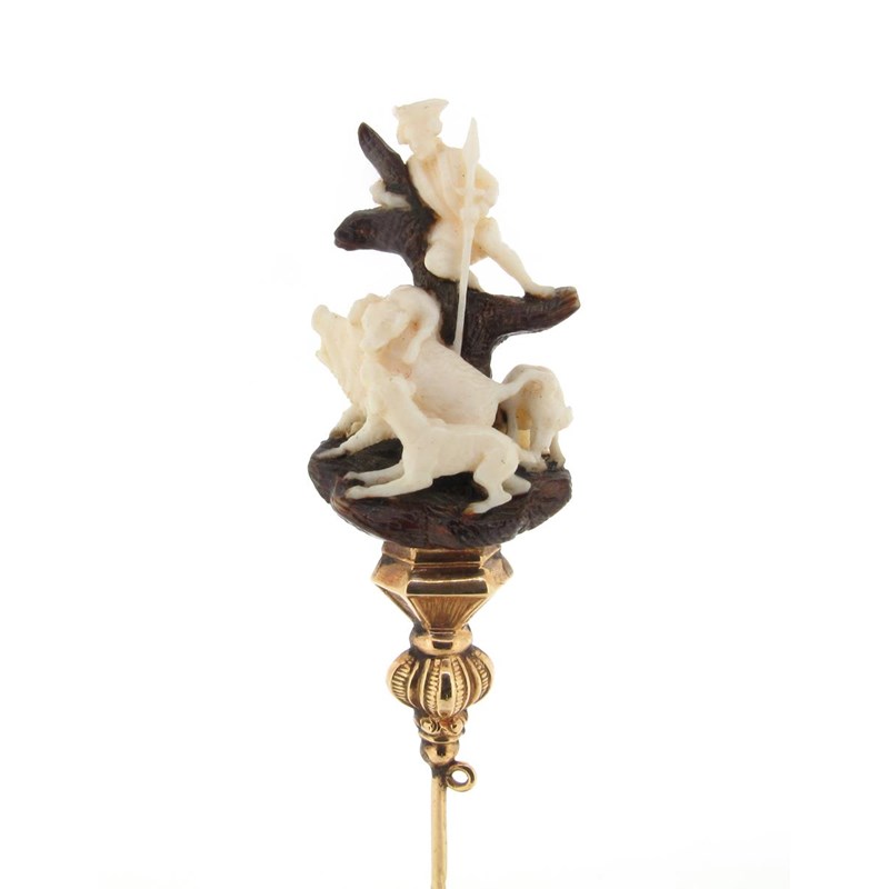 A realistically carved German hunting stick pin, depicting a huntsman with a pack of dogs attacking a wild boar in ivory around a tree carved out of wood, set in yellow gold, with turned ivory stand and glass domed cover