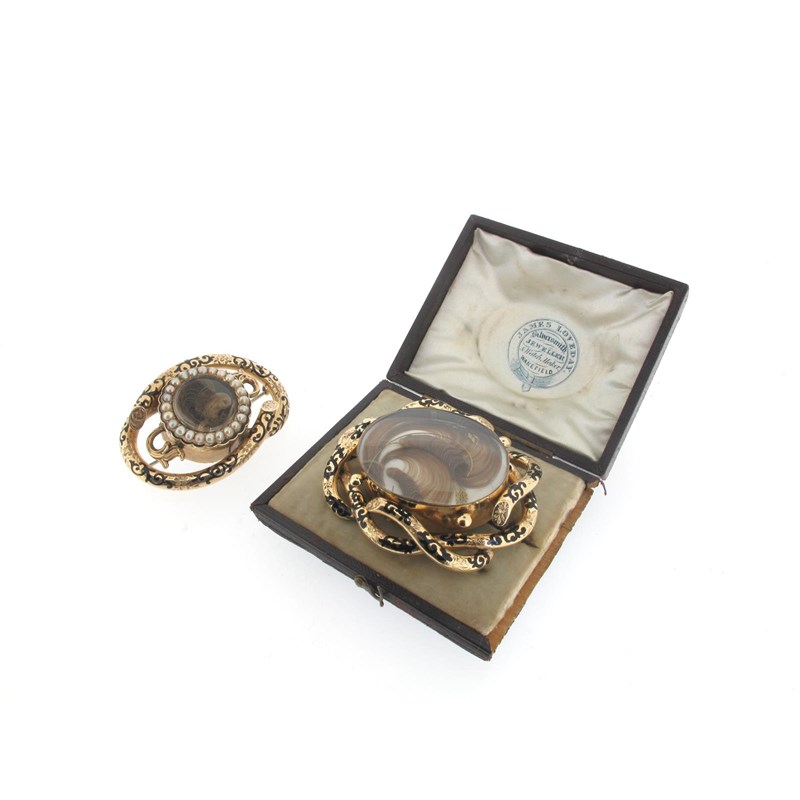 A 19th century gold mourning brooch, with a central glazed locket compartment containing hair, with scrolling gold border with black enamel decoration, fitted case, 6.2cm wide, with another similar gold brooch decorated with seed pearls, 5.5cm wide
