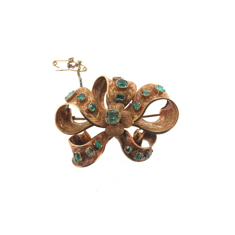A Victorian emerald-set gold bow brooch, of carved foliate design, 5cm wide