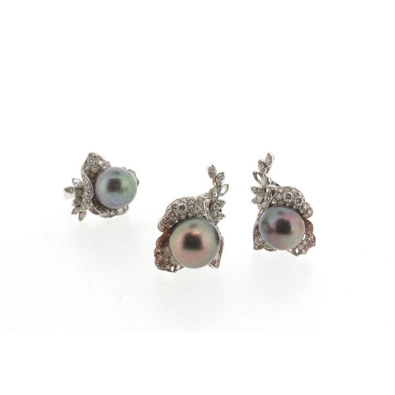 A cultured pearl and diamond foliate ring, the grey cultured pearl set in diamond-set foliate platinum surround, with a matching pair of cultured pearl and diamond earrings, size L ½