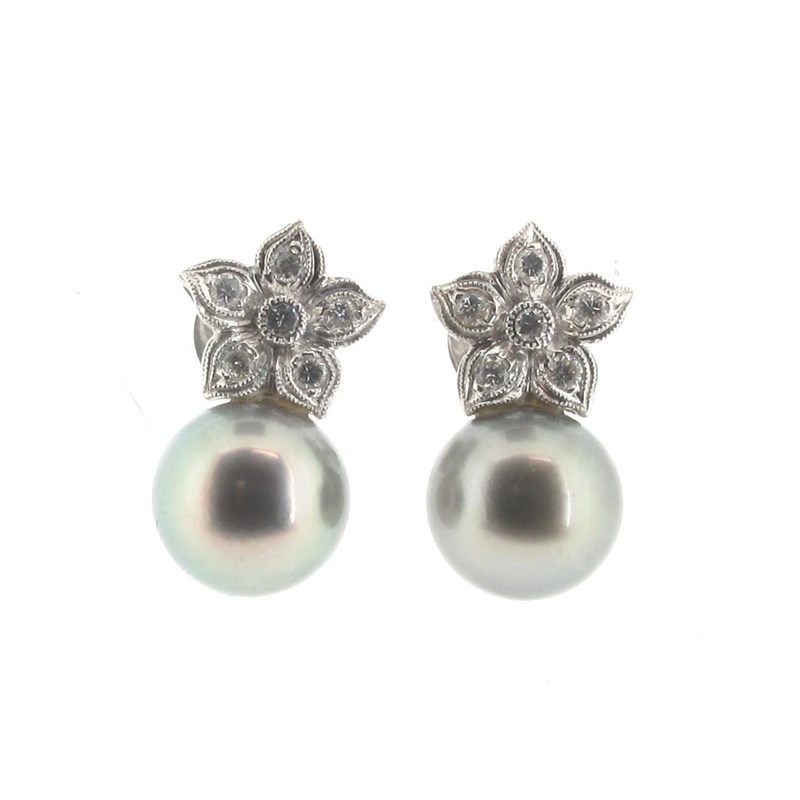 A pair of grey cultured pearl and diamond cluster earrings, the grey cultured pearls measure 10.8mm and suspend from foliate diamond clusters in white gold, stamped 750, post fittings