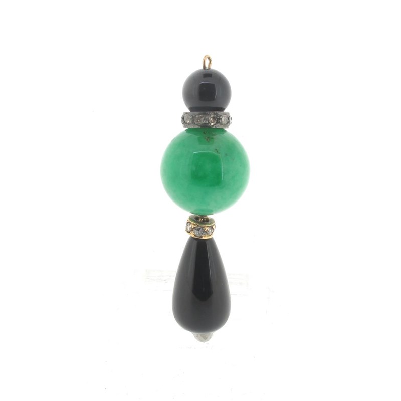 A jade, onyx and diamond pendant, centred with a spherical jade bead between two rose-cut diamond-set gold discs and suspending a drop-shaped black onyx bead, with a further rose-cut diamond bead to the base, with yellow gold fine-link chain, 5cm