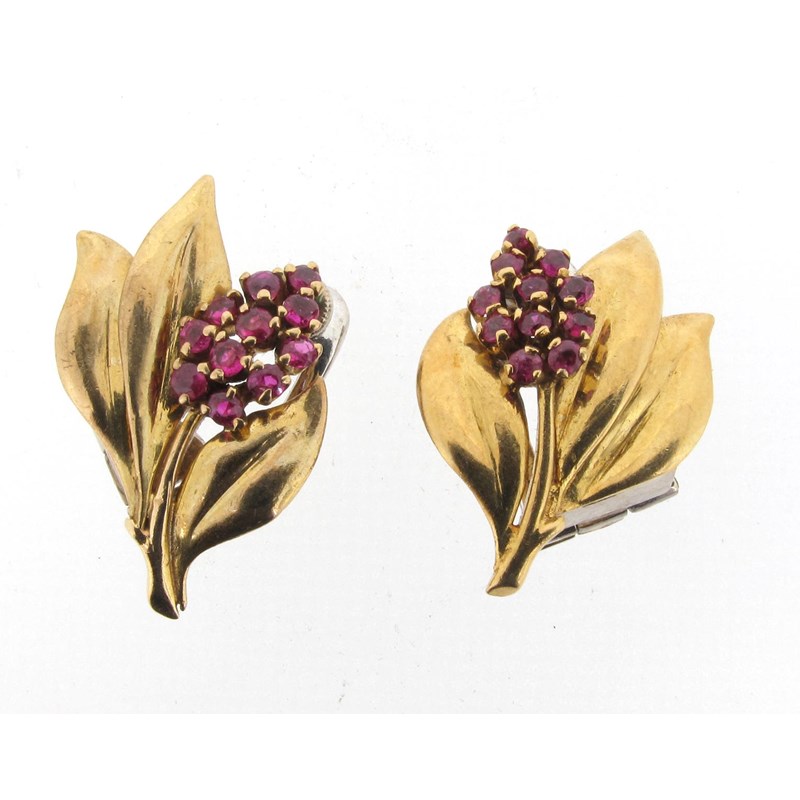 A pair of ruby-set gold foliate earrings, with white gold clip fittings, 2.5cm high