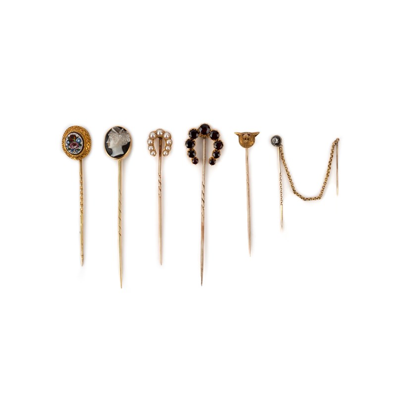 A collection of six stick pins, late 19th century, comprising stick pins topped with: a horseshoe in half pearls, pearls untested; a horseshoe in circular-cut garnets; a floral micromosaic; a hardstone cameo depicting a classical woman wearing a tiara; a gold fox head with cabochon ruby eyes; and a colourless paste within a black enamel border, longest stick pin 7.5cm, six cases