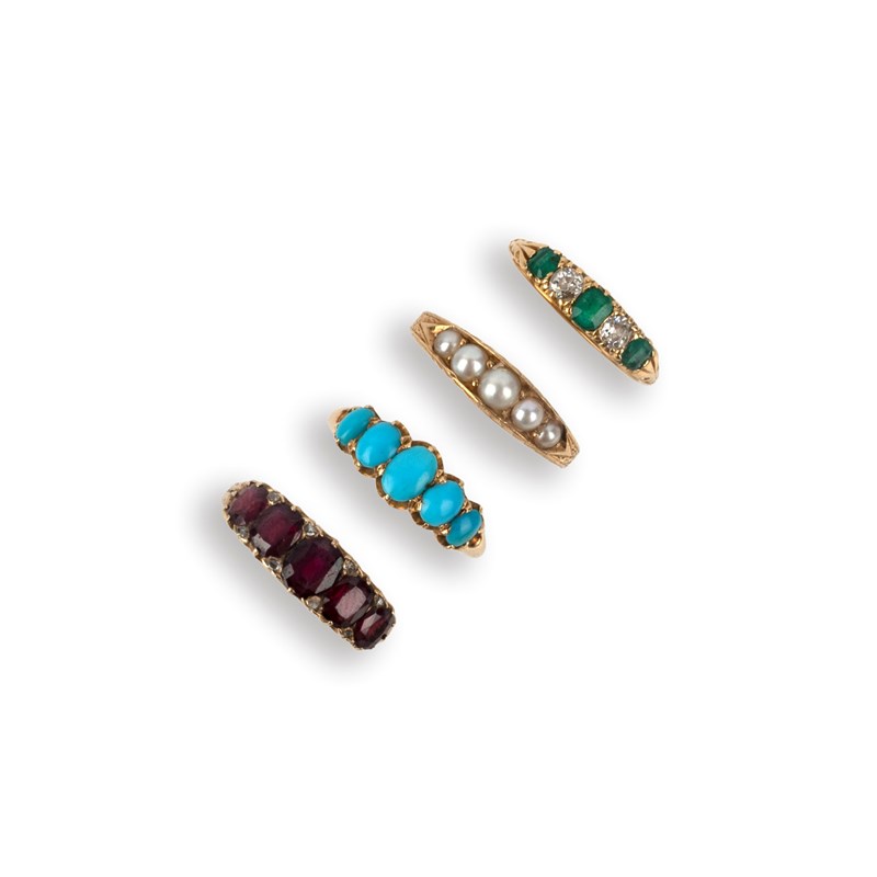 A collection of four rings, each of five-stone design, set with oval garnets and rose-cut diamonds; turquoise cabochons; half pearls; and step-cut emeralds with cushion-shaped diamonds respectively, mounted in gold, sizes K-N, pearls untested