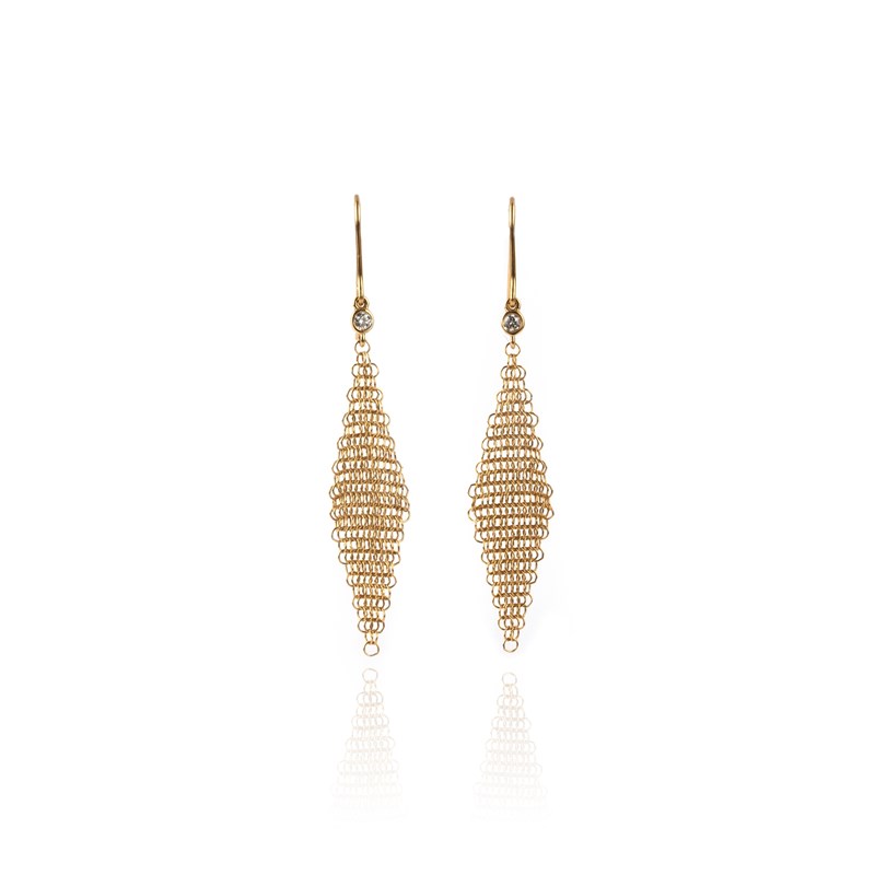 Elsa Peretti for Tiffany & Co., a pair of gold and diamond earrings, each composed of a spectacle-set brilliant-cut diamond suspending a section of gold chain mesh, length 5cm each, hook fittings, each signed Peretti, T&Co., stamped 750