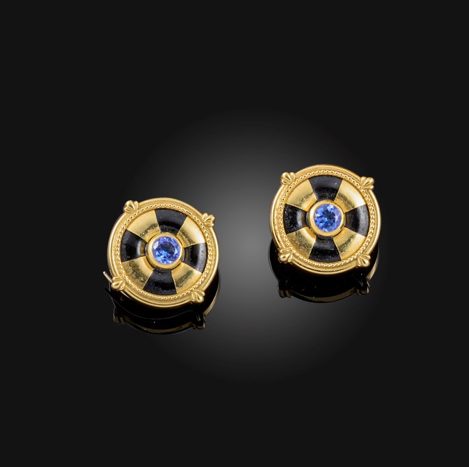 No reserve - Theo Fennell, a pair of gold, enamel and tanzanite earrings, circa 1994, each of circular outline, centring on a circular-cut tanzanite, within a gold border applied with sections of black enamel, diameter 2.5cm, clip and post fittings, signed Fennell, British hallmarks for 18ct gold, sponsor's mark TF