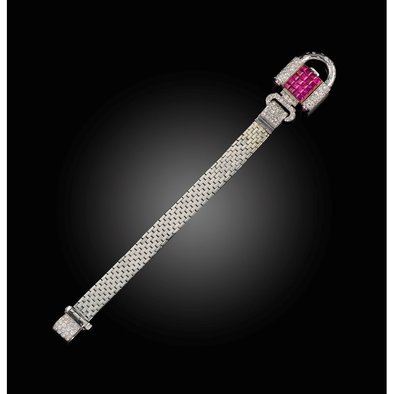 A ruby and diamond watch, mid 20th century, of padlock design, set with circular-cut diamonds, the central panel of calibré-cut rubies opening to reveal a square silvered dial with black enamel indicators and blued steel hands, to a brick link strap, mounted in platinum and white gold, case width 2.2cm, bracelet length 17cm, manual winding movement