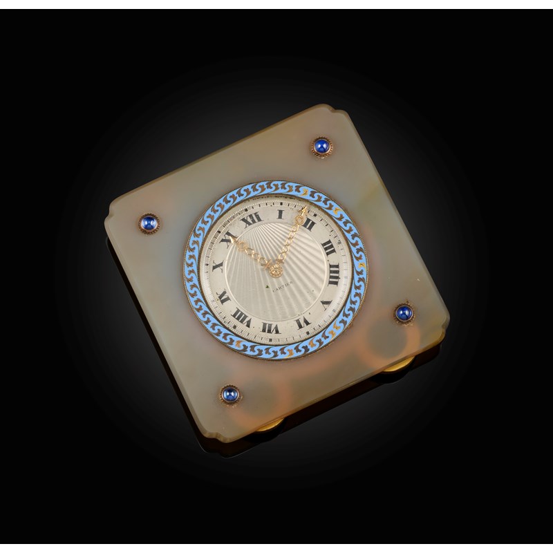 Cartier, an Art Deco agate, sapphire and enamel desk timepiece, circa 1920, the silvered dial of guilloché design, with black enamel Roman numeral indicators and openwork gold hands, within a bezel applied with light blue enamel with foliate motifs in reserve, to an agate frame of square outline with inverted corners, accented to each corner with a cabochon sapphire, the reverse with a gilt metal strut, dial 4.1cm diameter, frame 7.3 x 7.4cm, dial signed Cartier, back signed Cartier NY and EW&C Co. Inc France, numbered 399