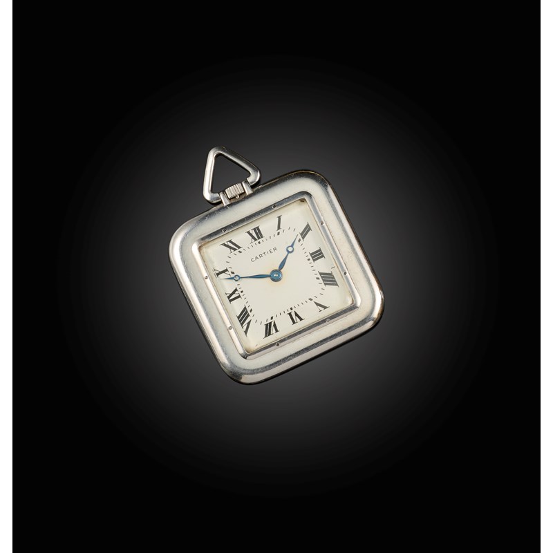 Cartier, a white gold fob watch, mid 20th century, the square white dial with black Roman numeral indicators and blue steel hands, within a plain square case, to a triangular suspension hoop, length 5.2cm including suspension hoop, manual winding movement, dial signed Cartier, movement signed European Clock and Watch Co., interior of case with French assay mark for 18ct gold, maker's mark EJ with hour glass for Jaeger, numbered 10253, 3743 and 4517, case back interior numbered 5253 and 3743, later case stamped Cartier