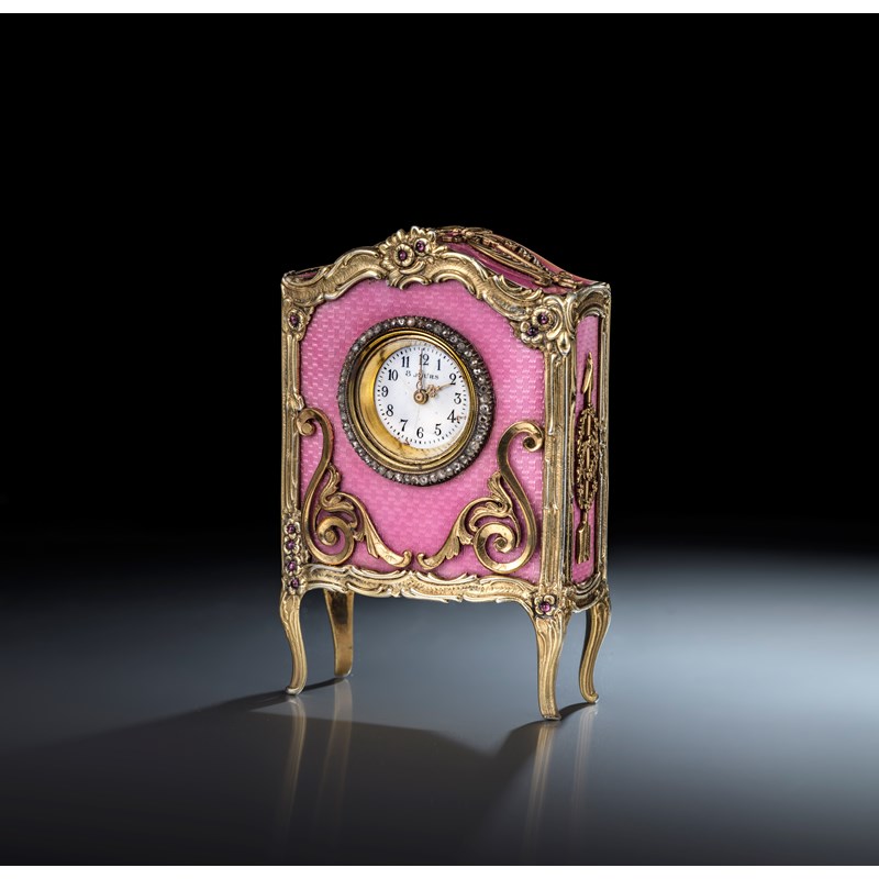Boucheron, a rare enamel, ruby and diamond desk timepiece, early 20th century, the circular white enamel dial inscribed '8 Jours', with black enamel indicators and gold hands, within a border of rose-cut diamonds to a gilt silver case designed in the Rococo revival style on four cabriole legs, applied to the front and sides with pink guilloché enamel, accented by floral motifs set with cabochon rubies, measuring 8.5 x 5.6 x 2.4cm, reverse signed Boucheron, French sponsor's mark LK with cockerel, French assay marks for silver, stamped 900, gilt metal winding key, original fitted case stamped Boucheron
