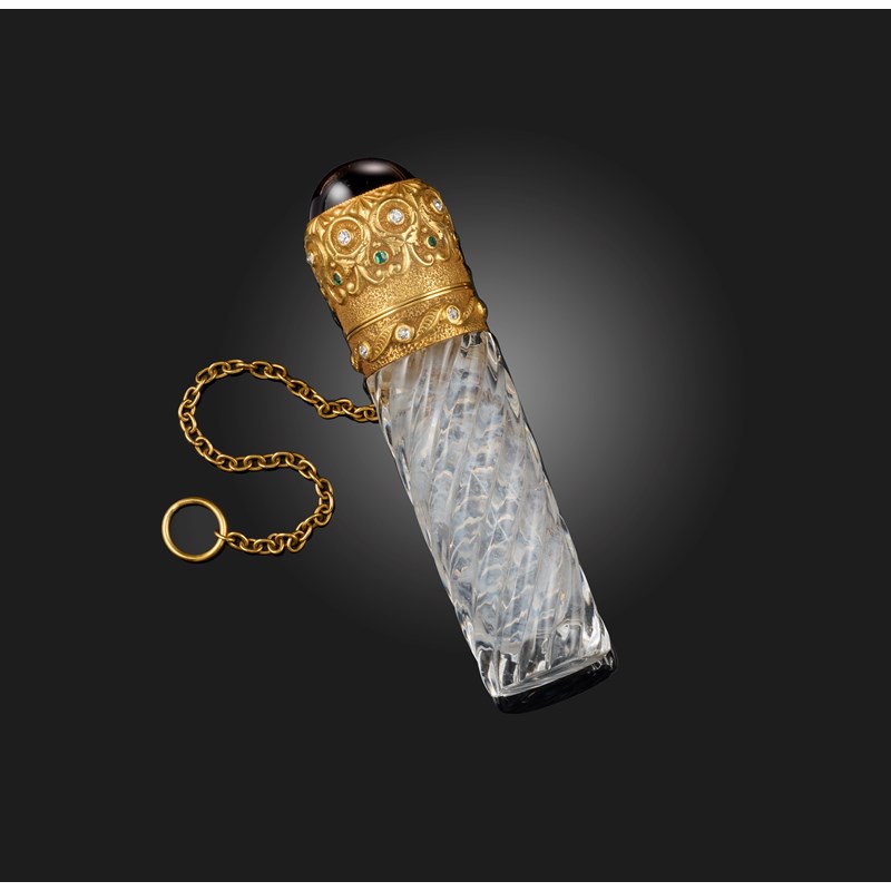An amethyst, emerald and diamond scent bottle, late 19th/early 20th century, the twisted cylindrical glass bottle mounted in textured gold of foliate design with a hinged lid, set with a cabochon amethyst, circular-cut diamonds and step-cut emeralds, length 8.8cm