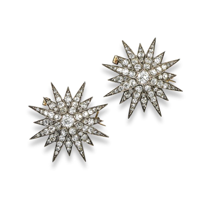 Two matching Victorian diamond star brooches, set with graduated cushion-shaped diamonds in silver and gold. Each brooch 3.5cm wide.