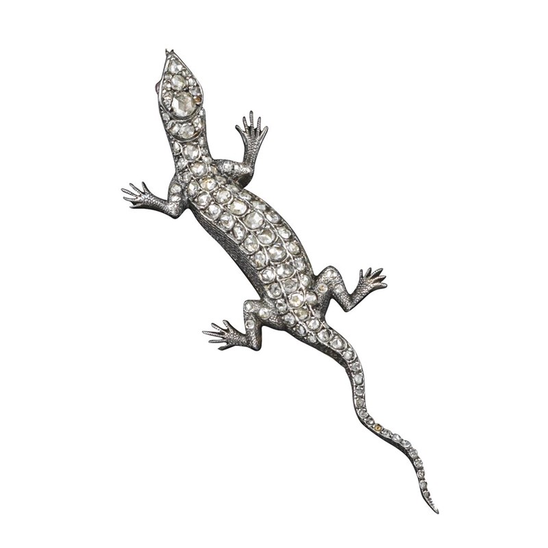 A late Victorian diamond-set salamander brooch, realistically formed, the body pave-set with rose-cut diamonds and ruby cabochon eyes in silver and gold. 9cm long. With detachable brooch fitting. Fitted case.