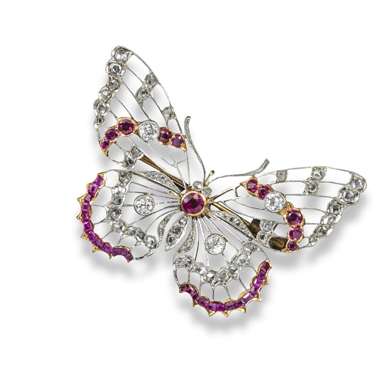 An Edwardian ruby and diamond openwork butterfly brooch, the body centred with a circular-cut ruby and set to the abdomen and eyes with rose-cut diamonds. Each wing is set with an old circular-cut diamond, the upper wings further set with circular-cut rubies and rose-cut diamonds, the lower wings with calibré-cut rubies and rose-cut diamonds. Pierced platinum and yellow gold mount. 5.3cm wide.