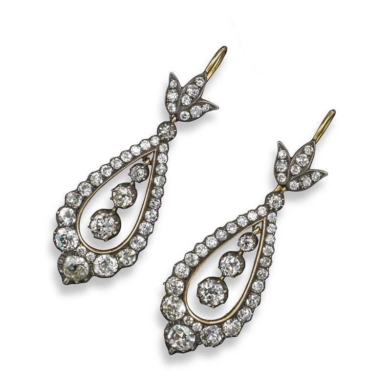 A pair of diamond drop earrings, the stylised fleur-de-lys top section suspends a pear-shaped scallop edged drop set with a line of graduated circular-cut diamonds and three circular-cut diamonds on a knife edge line within, set in silver and gold. 5cm long.