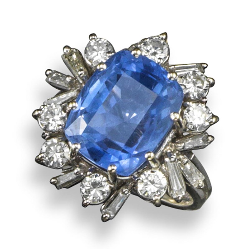 A sapphire and diamond cluster ring, the cushion-shaped pale blue sapphire is set within a surround of circular and tapered baguette-shaped diamonds in white gold. Size L 1/2.